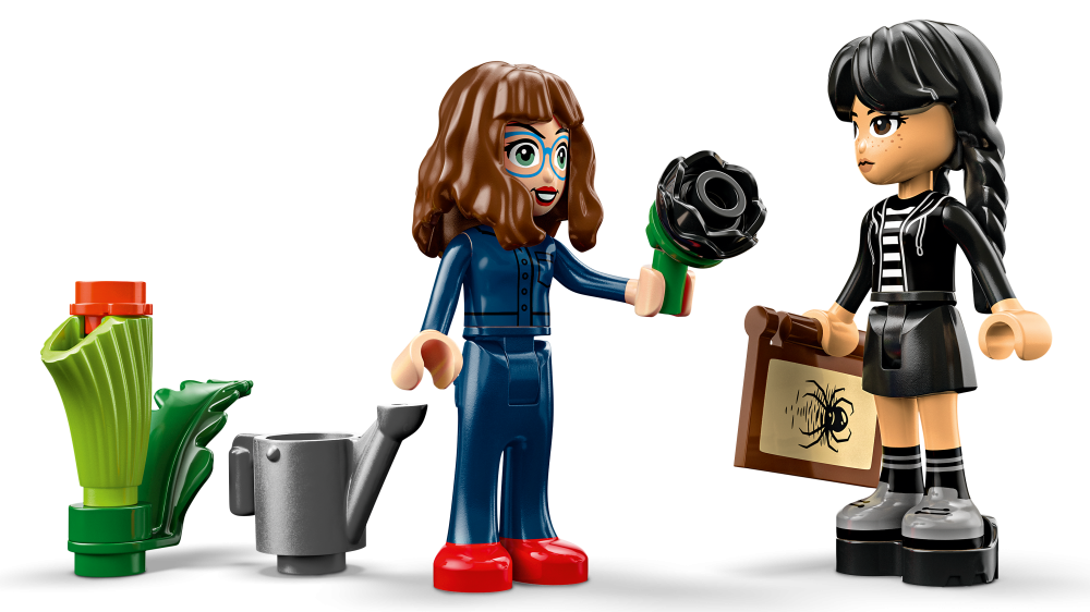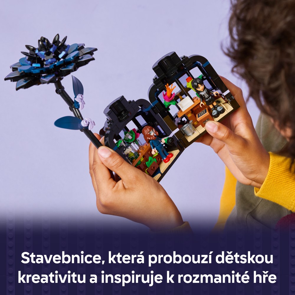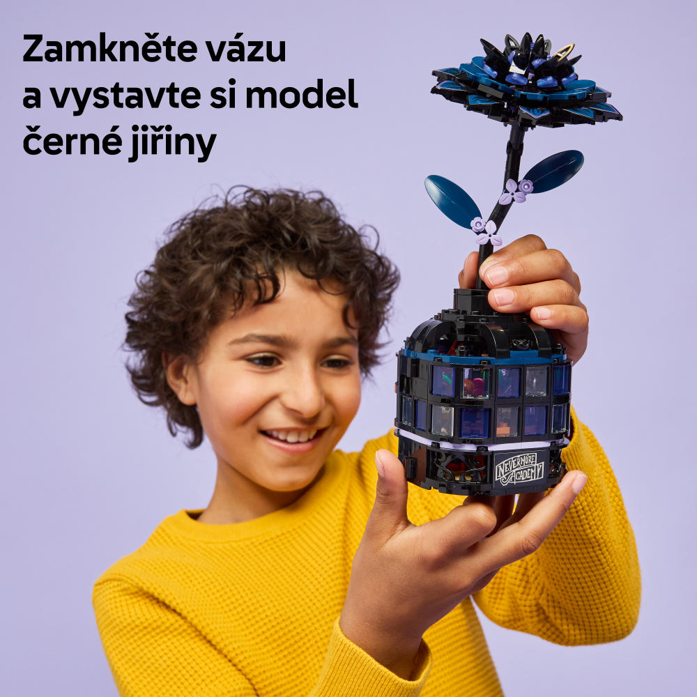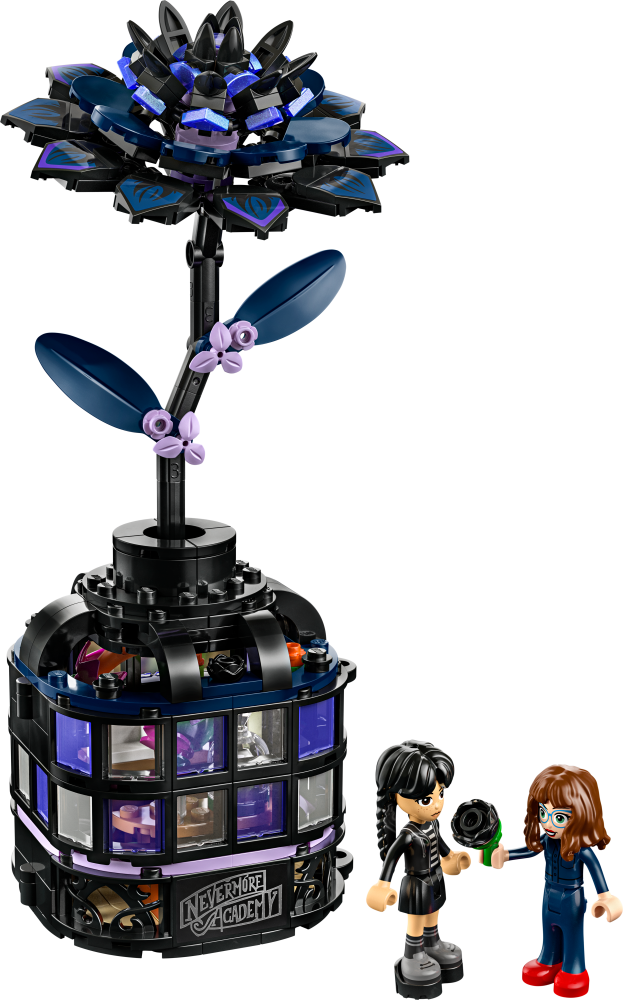 Stavebnica LEGO® Wednesday (76784) Čierna georgína predstavuje elegantný výstavný kúsok pre milovníkov botaniky a dizajnu od 9 rokov. Táto bytová dekorácia obsahuje čiernu georgín s listami a svetlo fialovými púčikmi a vázu, ktorá pripomína miniatúrnu zimnú záhradu. Po zostavení môžu deti odňať kvet georgíny, odomknúť vázu a odhaliť učebňu vo vnútri, v ktorej nájdu odnímateľné lavice, stoličku a ďalšie doplnky na rozprávanie príbehov. Súčasťou stavebnice sú aj minibábiky Wednesday Addamsovej a profesorky Marilyn Thornhillovej na hranie na postavy.